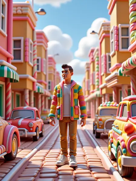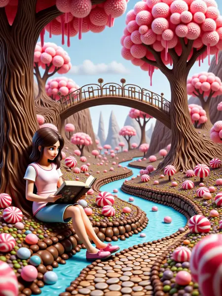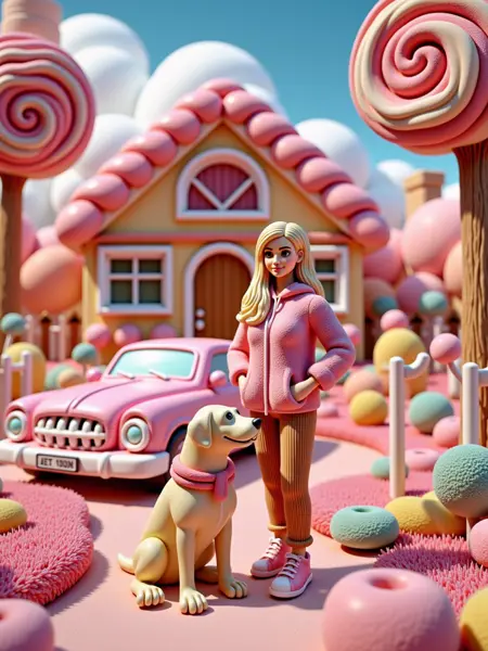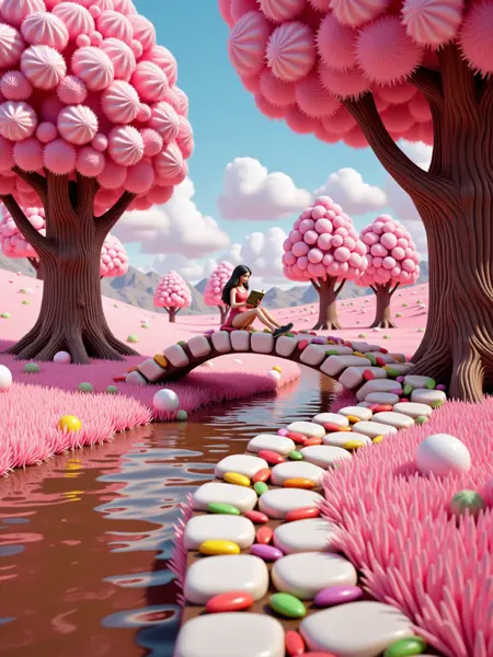 더 강렬한 캔디랜드 분위기를 원한다면 프롬프트를 구체적으로 작성하세요. "분홍색 잔디, 폰당 의상, 생강빵 집"과 같은 물체와 풍경을 설명하면 LoRA가 학습된 개념을 더욱 잘 인식하여 장면을 더 생동감 있게 만들어줍니다.