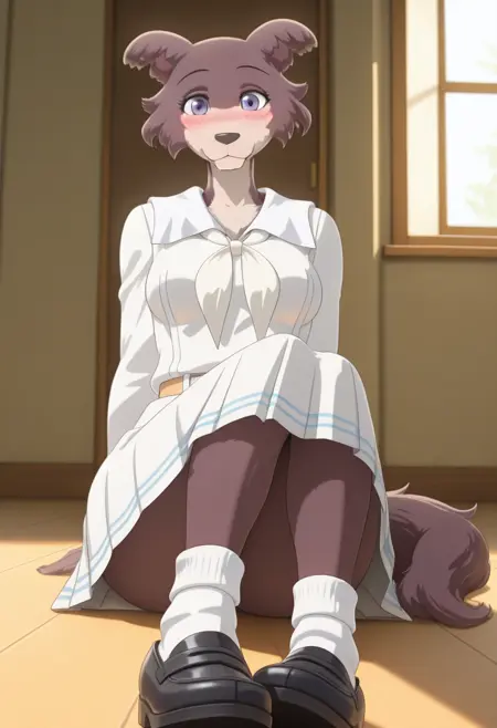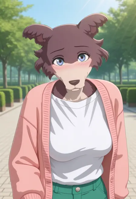주요 프롬프트: juno, 늑대 소녀, 동물 귀, 동물 코, 갈색 털, 단발, 파란 눈, 꼬리