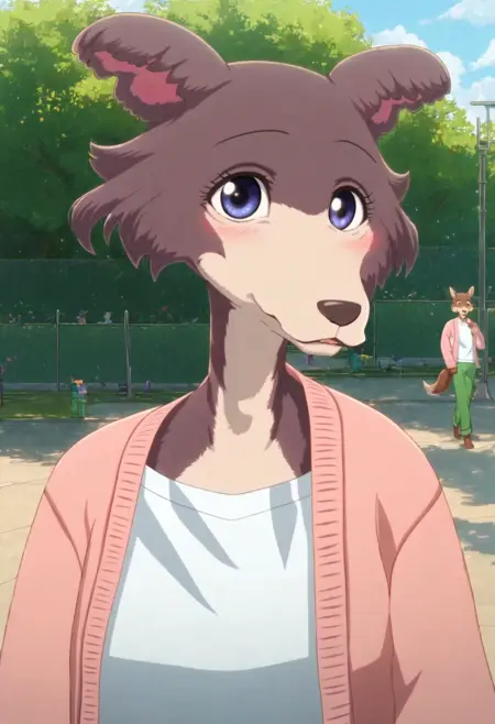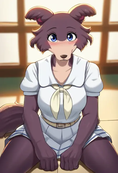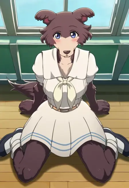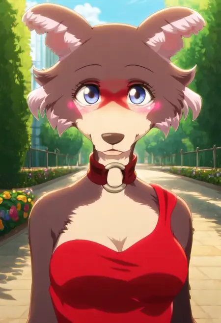Main prompts: juno, wolf girl, animal ears, animal nose, brown fur, short hair, blue eyes, tail