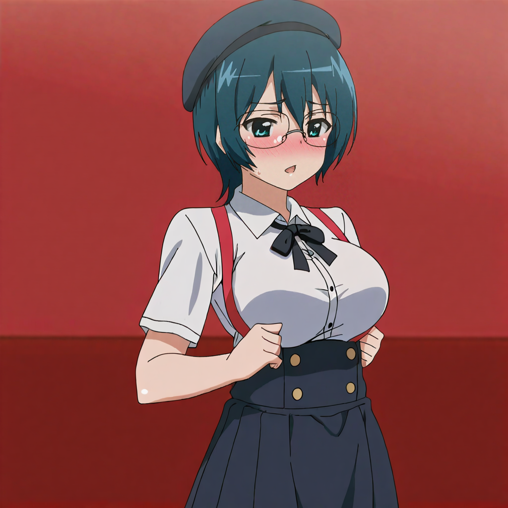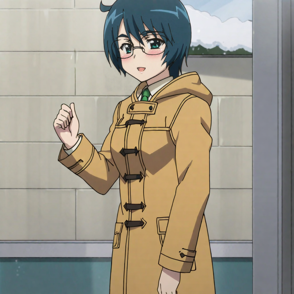 触发词:Mikuni, 学校制服, 1girl, 眼镜, 短发, serafuku, 裙子, 蓝发, uwabaki, 蓝眼, 西部镜头