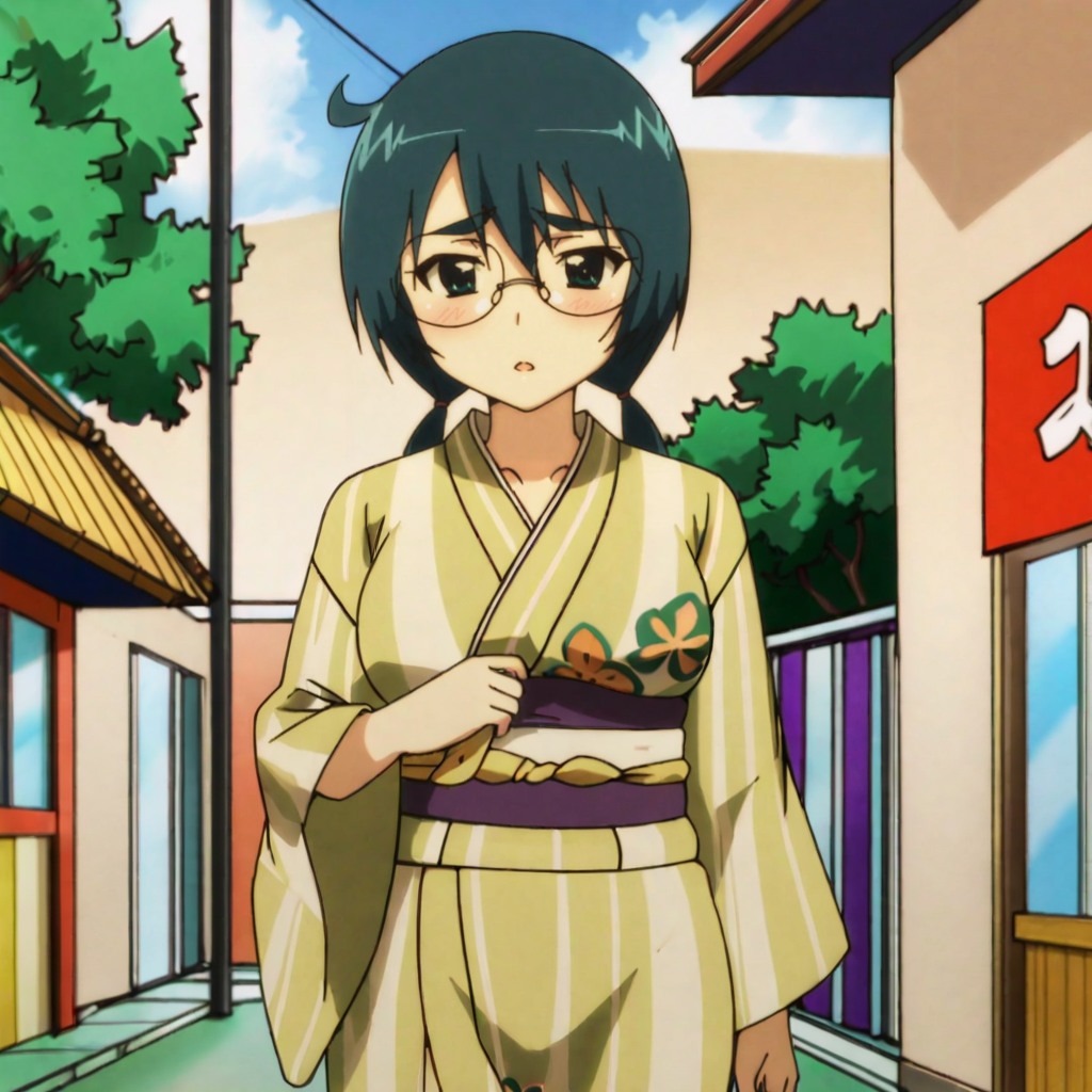 穿浴衣触发词:MikuniYukata, 1girl, 日式服装, 眼镜, 和服, 短发, 浴衣, 蓝发, 黑眼, 西部镜头