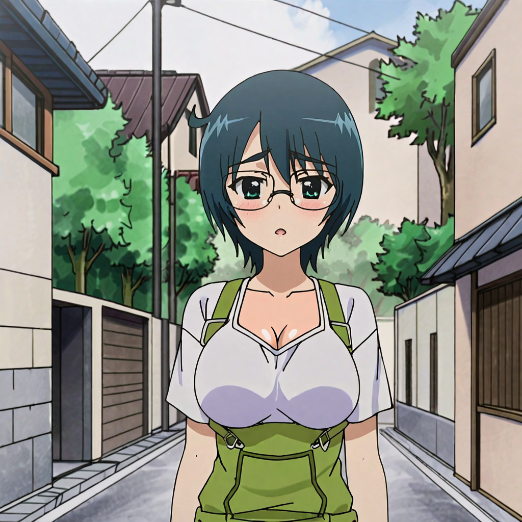 穿绿色工装裤触发词:MikuniGreenOutfit, 眼镜, 大胸部, 短发, 1girl, 白色上衣, 工装裤, 绿眼, 胸部曲线, 黑发, 西部镜头
