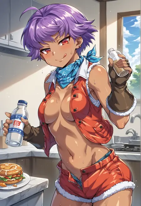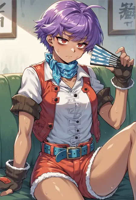 注目タグ: 暗い肌、赤い目、短い髪、紫の髪、アホ毛、イヤリング、首元のバンダナ、カラー、白いシャツ、短い袖、ファーのフリル、ベスト、指なし手袋、ショートパンツ、ベルト、太ももホルスター、ブーツ
