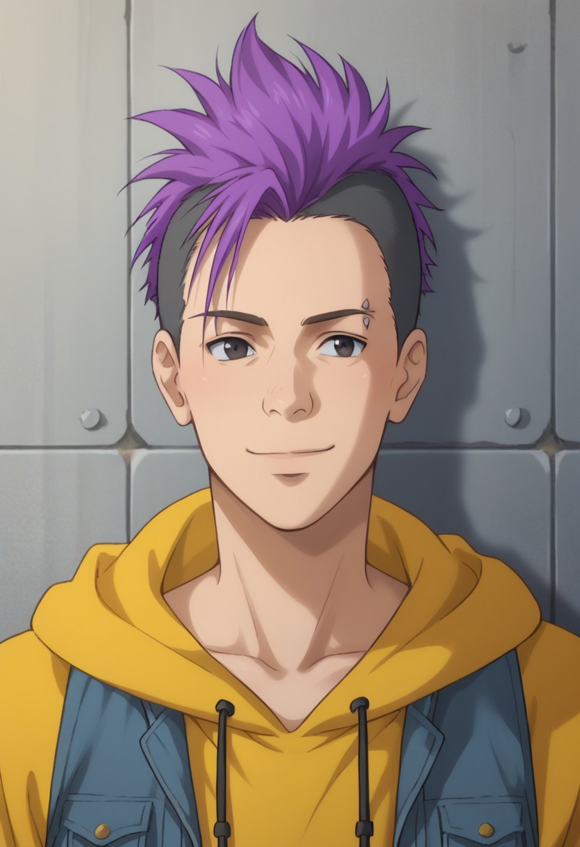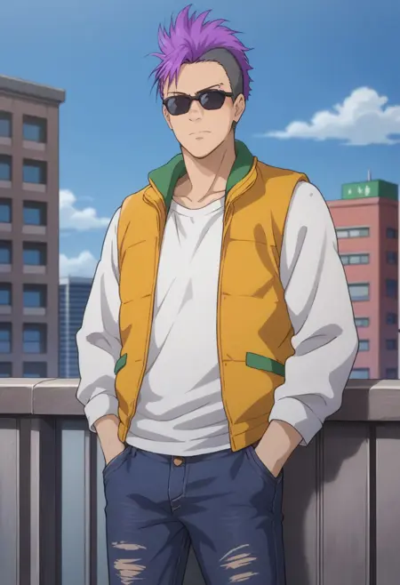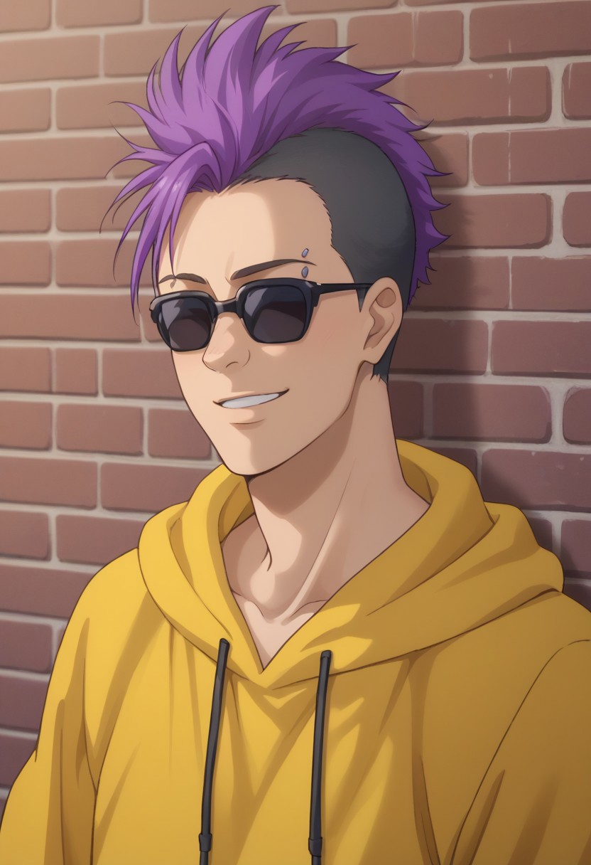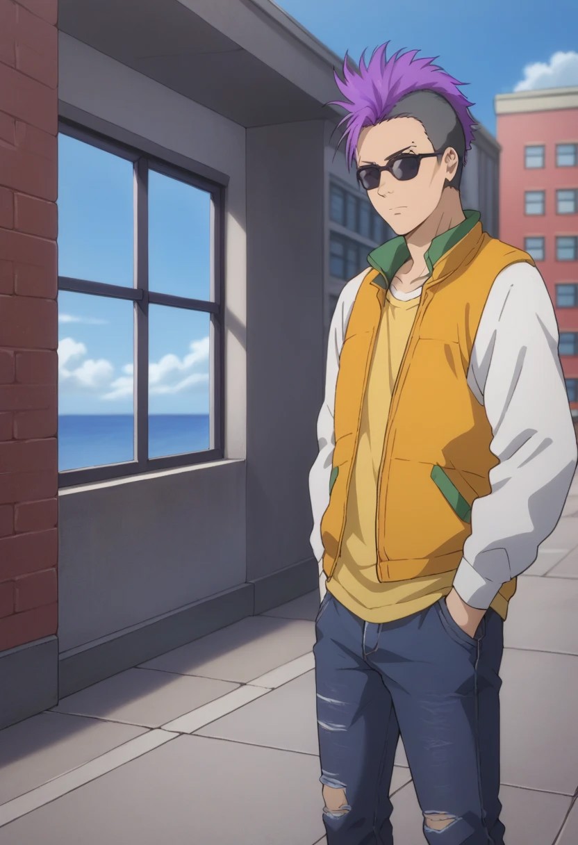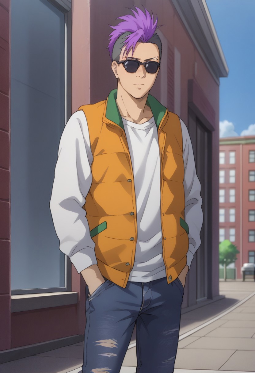 shwongu, 1boy, male focus, solo, sunglasses, mohawk, multicolored hair, purple hair, black hair, yellow hoodie, denim vest, pants,