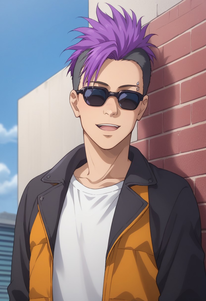 shwongu, 1boy, male focus, solo, sunglasses, mohawk, multicolored hair, purple hair, black hair, orange shirt, collared shirt, sleeveless jacket, grey jacket, long sleeves, pants,