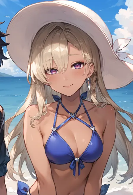 标签(服装B):露背式,紫色比基尼,太阳帽,