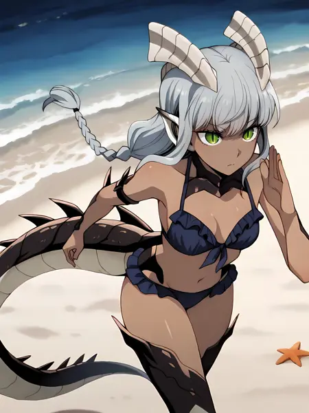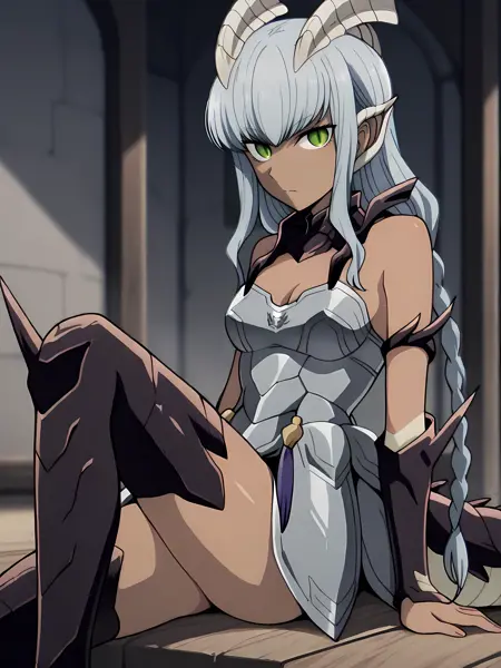 waldelia, long silver hair ,twin braids, green eyes,slit pupils ,dark skin,dragon girl, white horns,monster girl,bangs,pointy ears,scales ,dragon tail