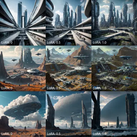 과학 소설 장르의 풍경 24장에서 기반한 LoRA를 생성했습니다. LoRA는 건물과 환경에 기술적인 이미지를 추가하며, Flux를 통해 개선하고 Luma 또는 Kling에서 애니메이션화할 수 있는 뛰어난 장면을 제공합니다.