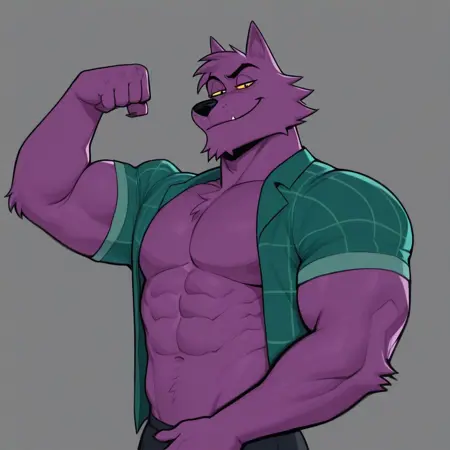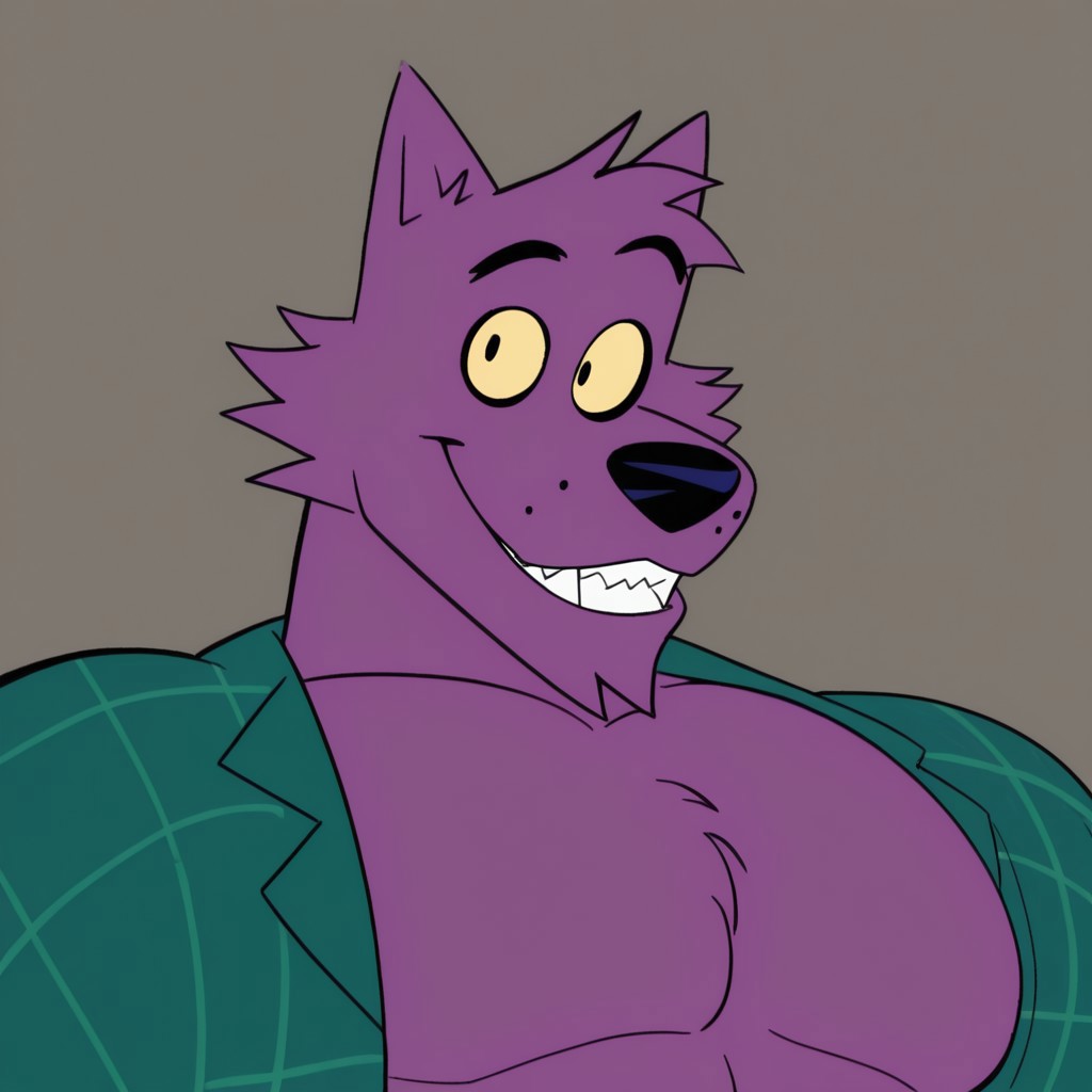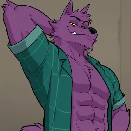 wolf, anthro, purple fur, yellow sclera, 1fang,
