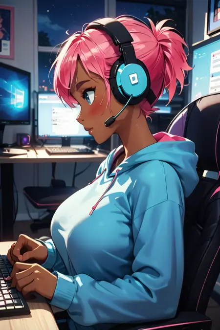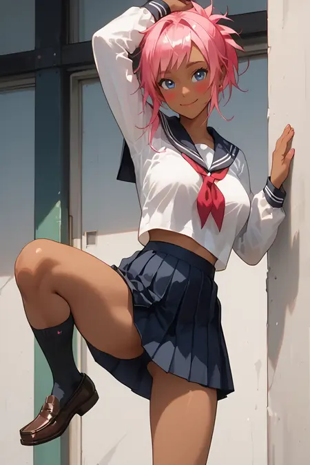 エレン、1人の少女、短い髪、ピンクの髪、青い目の、肌が濃い、大きな胸