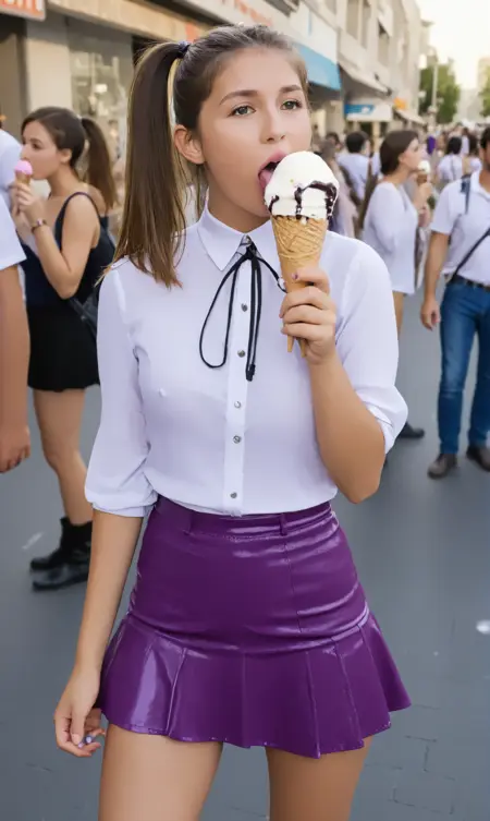 licicc, 슬림한 25세 소녀가 아이스크림콘을 빨고 있음, 공원에서 서 있는 모습. 긴 금발 팔랑머리.