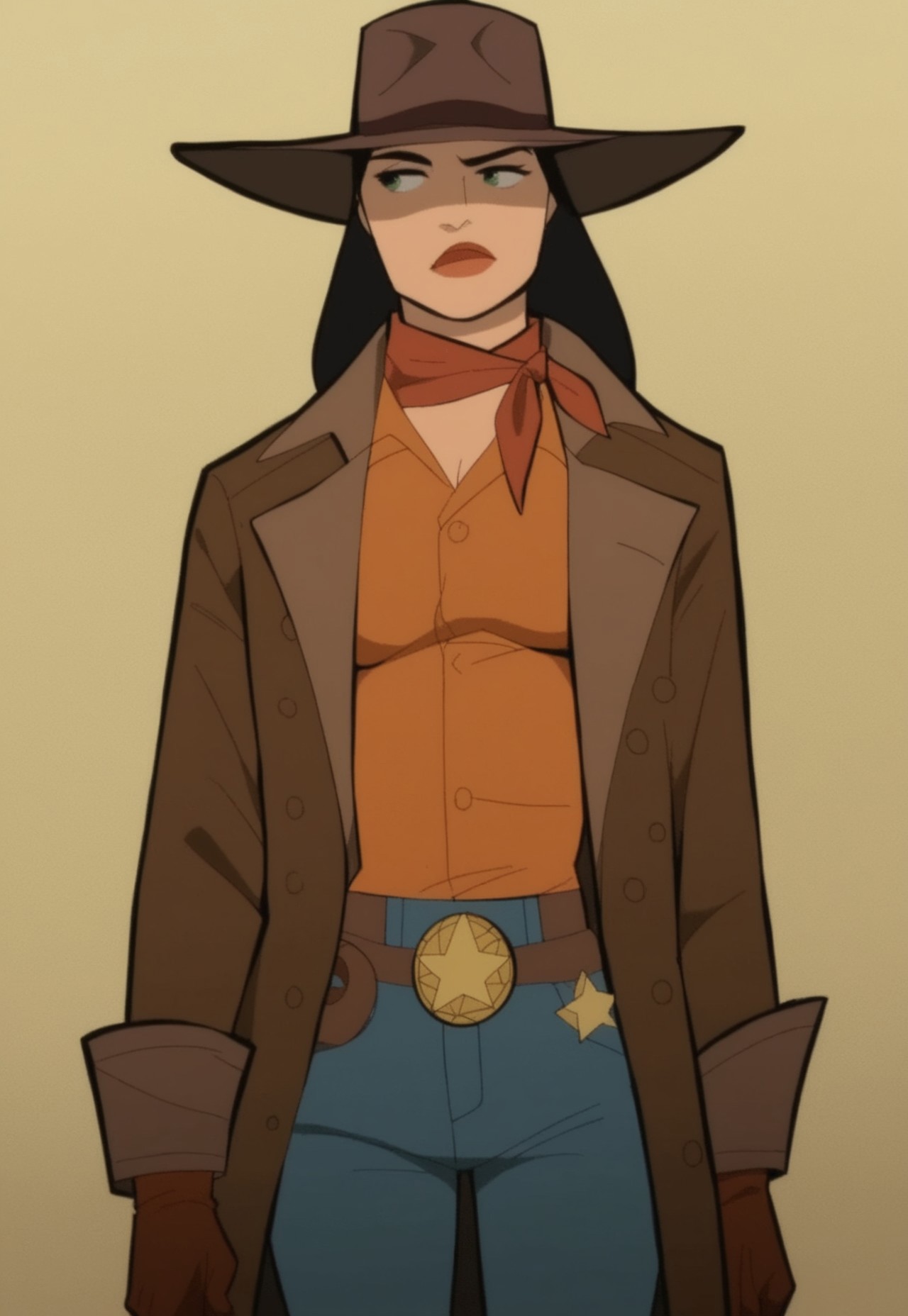 ウェスタン風衣装: コート、カウボーイハット、ネッカチーフ、シャツ、ジーンズ、手袋、ブーツ(**コートをジャケット**に変更すると、異なる外観になります)