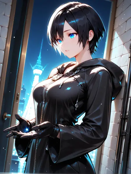 트리거: imtdxion, 1girl, black hair, short hair, blue eyes, bangs