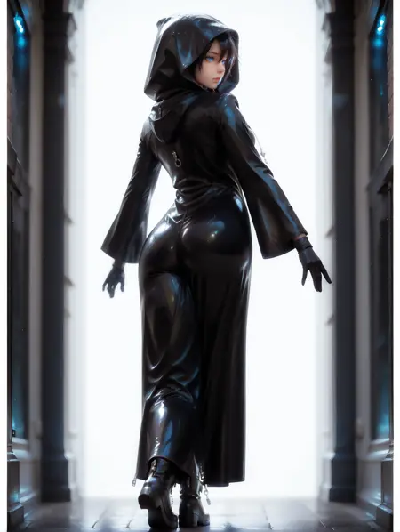복장 프롬프트: 후드, 장갑, 검은 장갑, 넓은 소매, 부츠, 검은 부츠