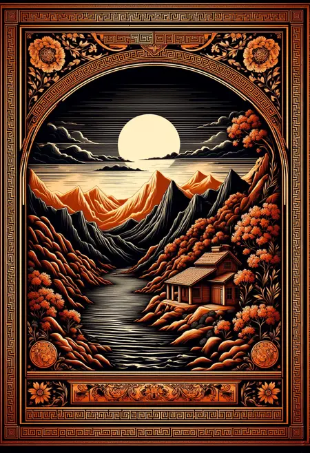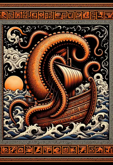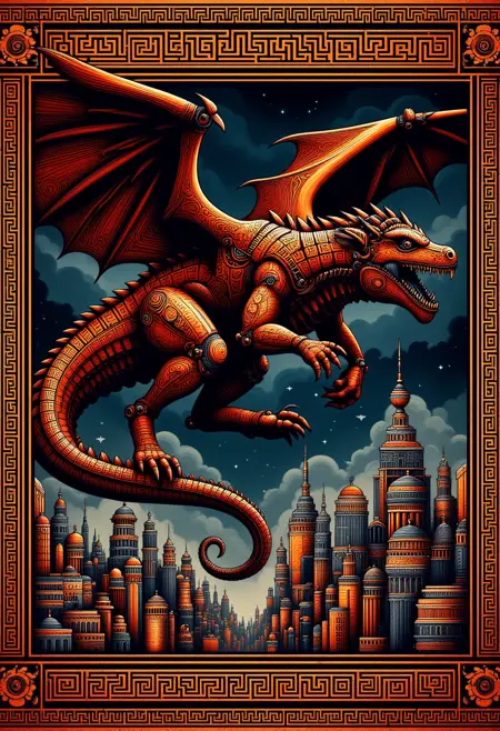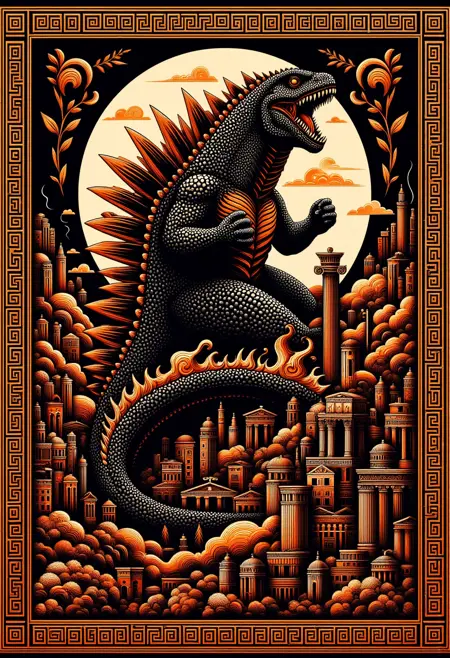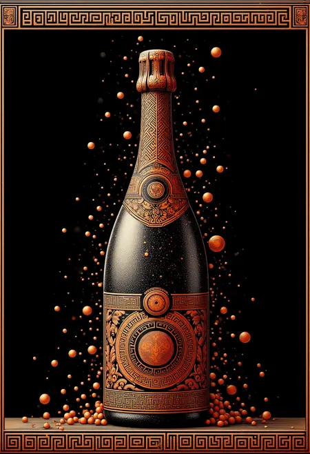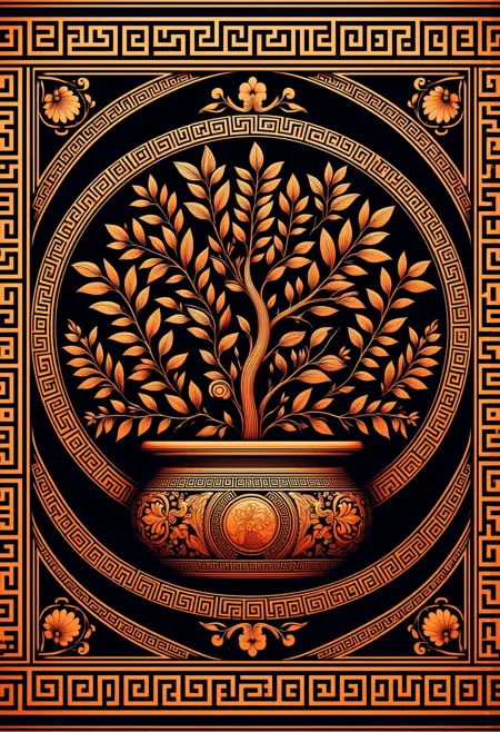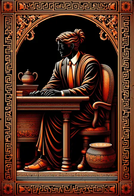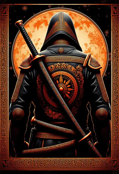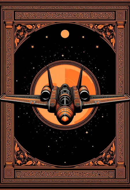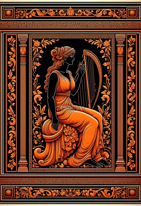 Flux: start your prompt with "grkptt, limited palette, orange theme, black background, two-tone color scheme orange black ancient greek" + your prompt