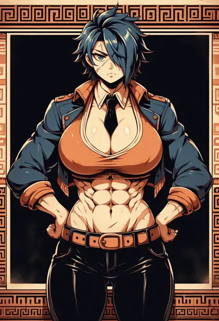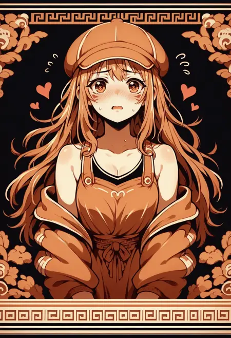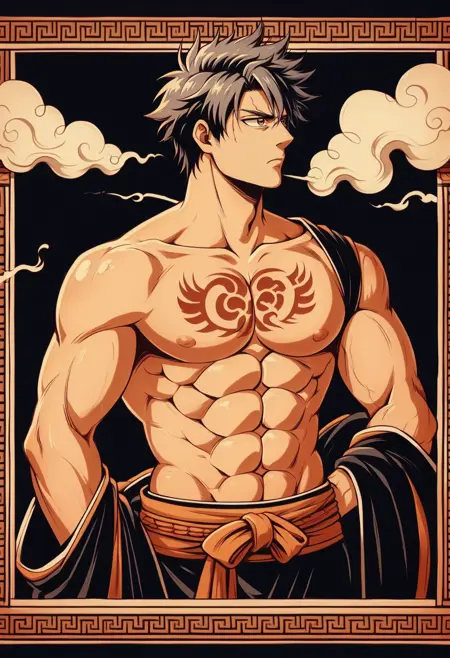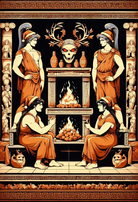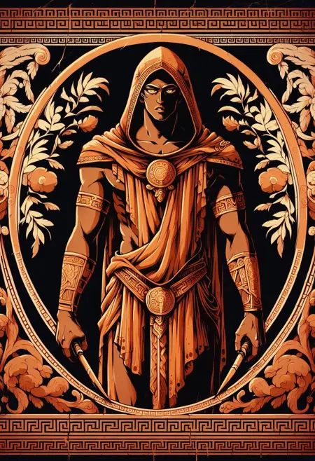 Flux:"grkptt, limited palette, orange theme, black background, two-tone color scheme orange black ancient greek" + 你的提示词 开始你的创作