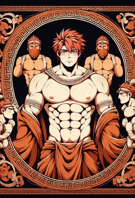 Flux: 以 "grkptt, limited palette, orange theme, black background, two-tone color scheme orange black ancient greek" + 你的提示词 开始你的创作
