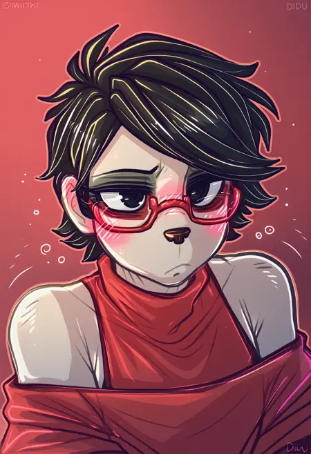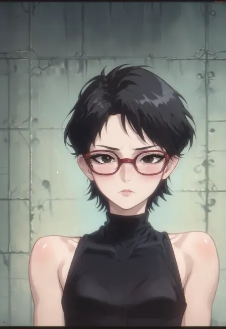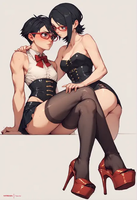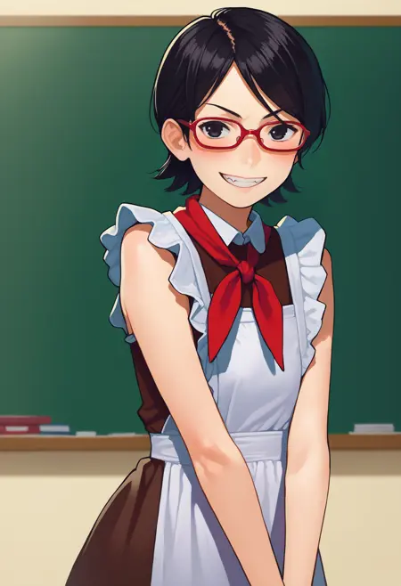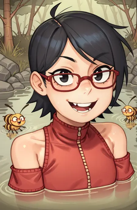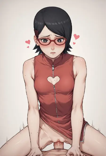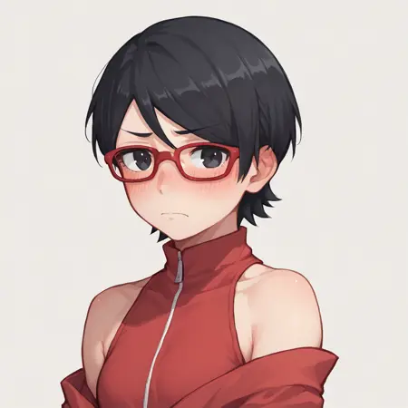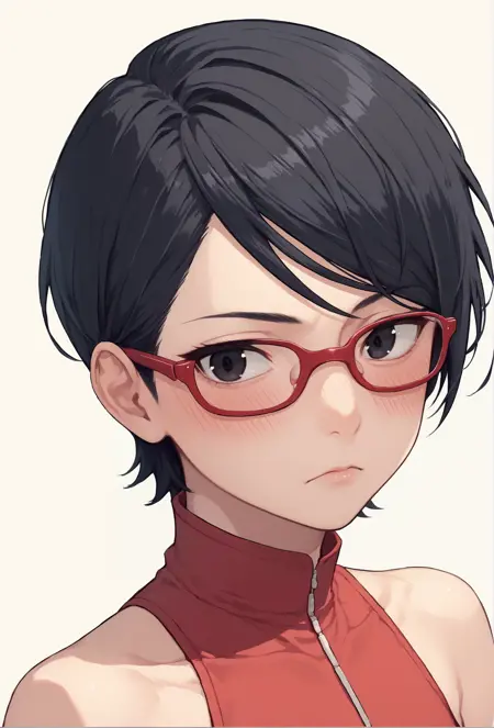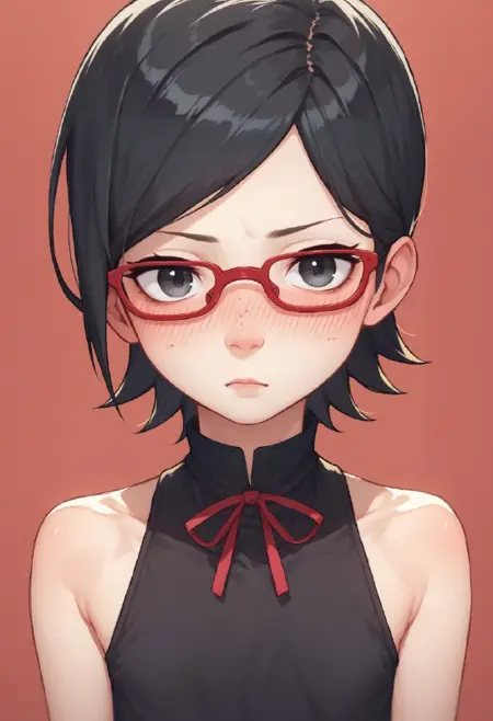uchiha sarada, bare shoulders, black eyes, black hair, red framed glasses, short hair,