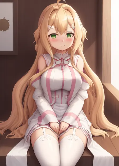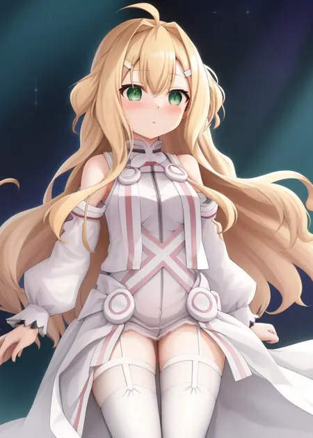 1명의 소녀, 홀로, 긴 머리, 밝은 금발, 초록빛 눈, 아호게, 흰색 헤어핀, 머리카락 가랑이, 드레스, 분리형 소매, 흰색 드레스, 흰색 허벅지까지 오는 양말, 서스펜서 스트랩,