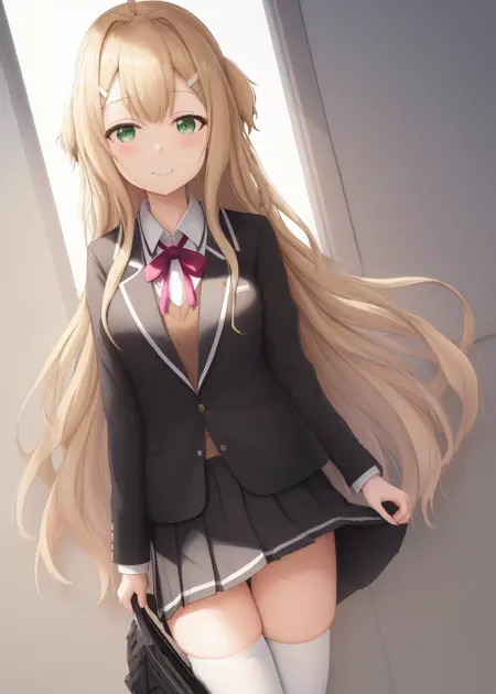 1명의 소녀, 홀로, 긴 머리, 밝은 금발, 초록빛 눈, 아호게, 흰색 헤어핀, 머리카락 가랑이, 리본, 학교복, 자켓, 검은 프릴 스커트, 흰색 팬티스타킹, 셔츠, 검은 블레이저, 목 리본