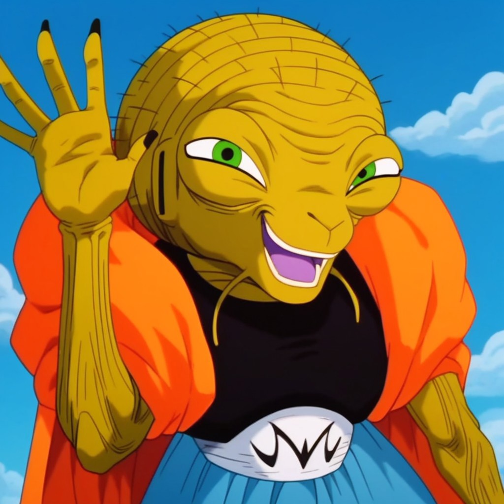 긍정적 프롬프트: BabidiDBZ, 외계인, 녹색 눈, 진한 노란 몸, 진한 노란 피부, 주황색 망토, 파란 로브, 검은 가슴판, 벨트