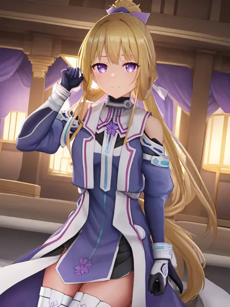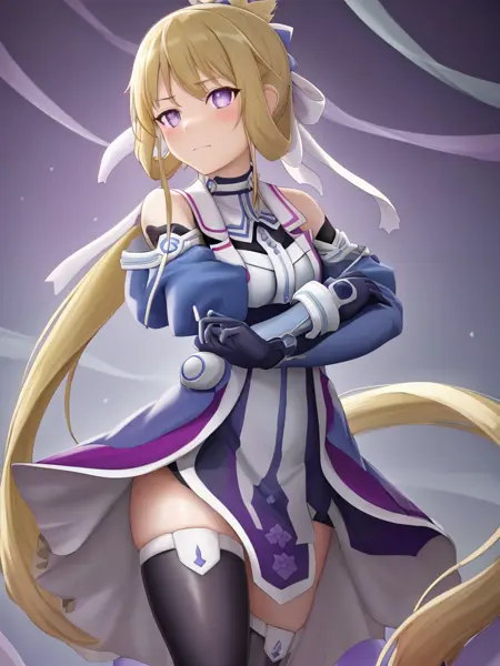 1girl, solo, blonde hair,very long hair,purple eyes, ponytail,hair between eyes, ribbon, bare shoulders, blue dress, blue sleeves,Magic Girl,