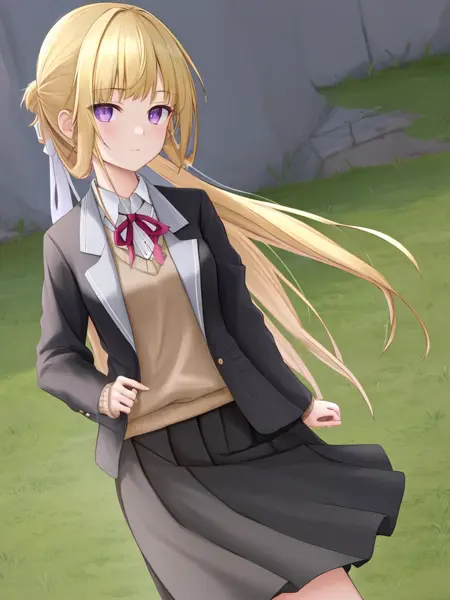 1girl, solo, long hair, skirt, blonde hair,purple eyes, ponytail, ribbon,school uniform,white shirt, collared shirt, black skirt, red ribbon, black jacket, neck ribbon, blazer,brown sweater,