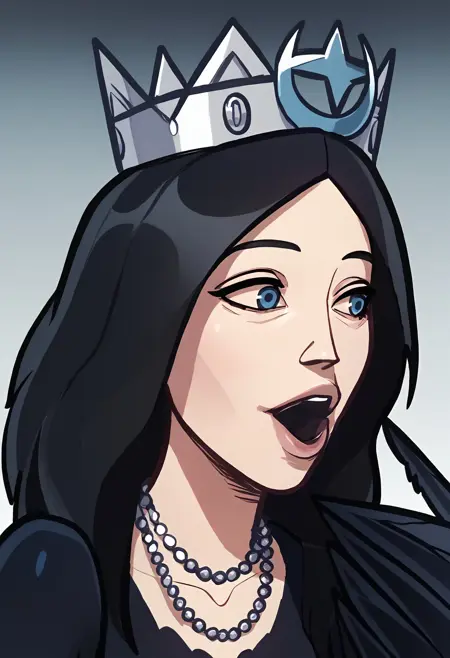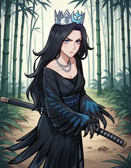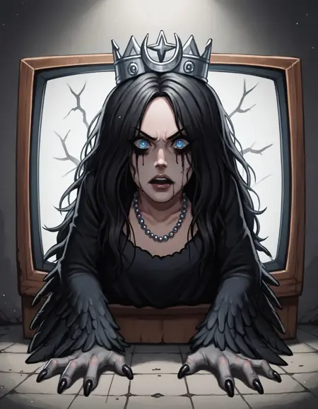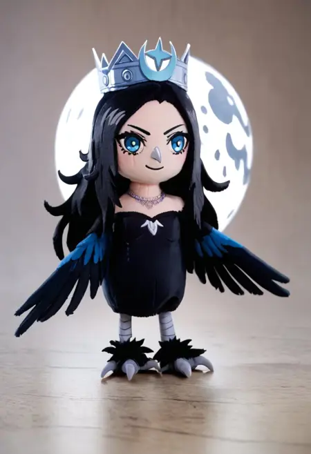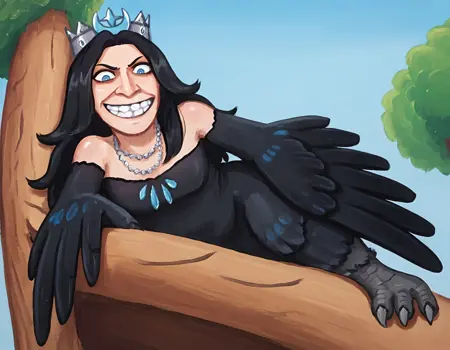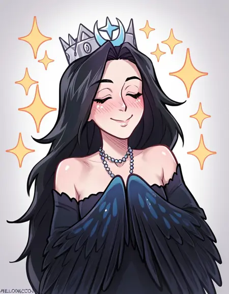 主要外观:长发、蓝眼睛、黑发、项链、黑色长裙、王冠、怪物女孩、羽毛、鹰身女妖
