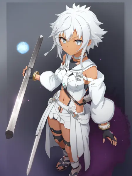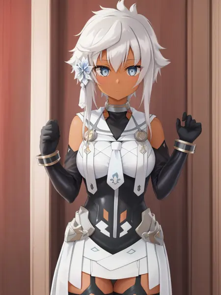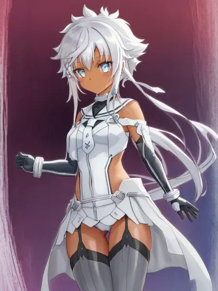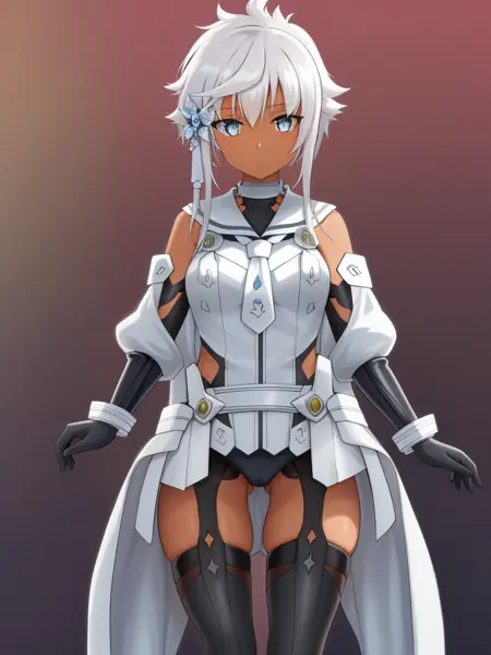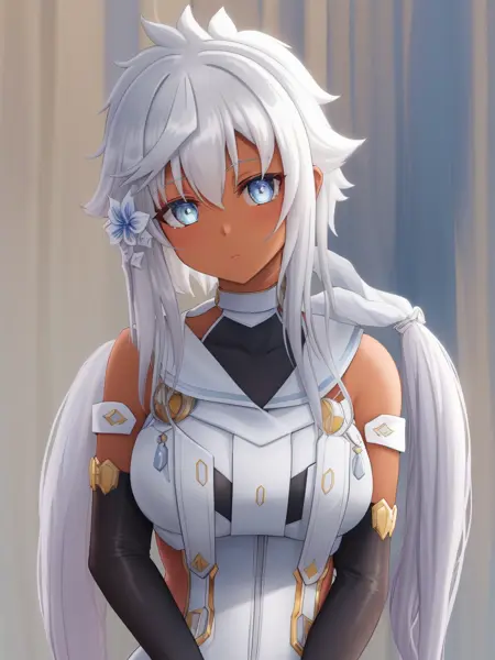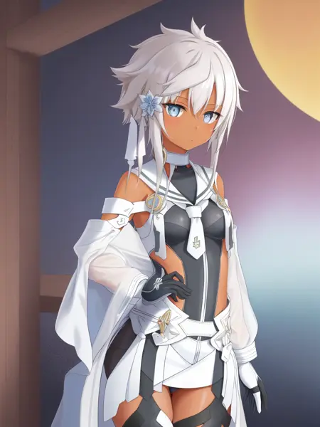 1녀성, 솔로, 흰 머리카락, 짧은 머리카락이 긴 머리카락이 있는 형태, 짧은 머리카락, 푸른 눈, 머리 장식, 어두운 피부, 측두부 머리카락, 무릎까지 오는 양말, 어깨 노출, 흰 머리카락, 흰 드레스, 레오타드,