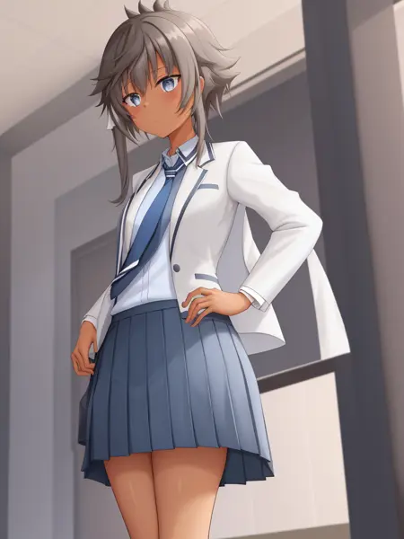 1녀성, 솔로, 짧은 머리카락, 회색 눈, 갈색 머리카락, 짧은 머리카락이 긴 머리카락이 있는 형태, 측두부 머리카락, 밝은 어두운 피부, 흰 머리끈, 학교 복장, 흰 셔츠, 오픈 재킷, 파란 치마, 무릎까지 오는 양말, 흰 재킷, 파란 넥타이