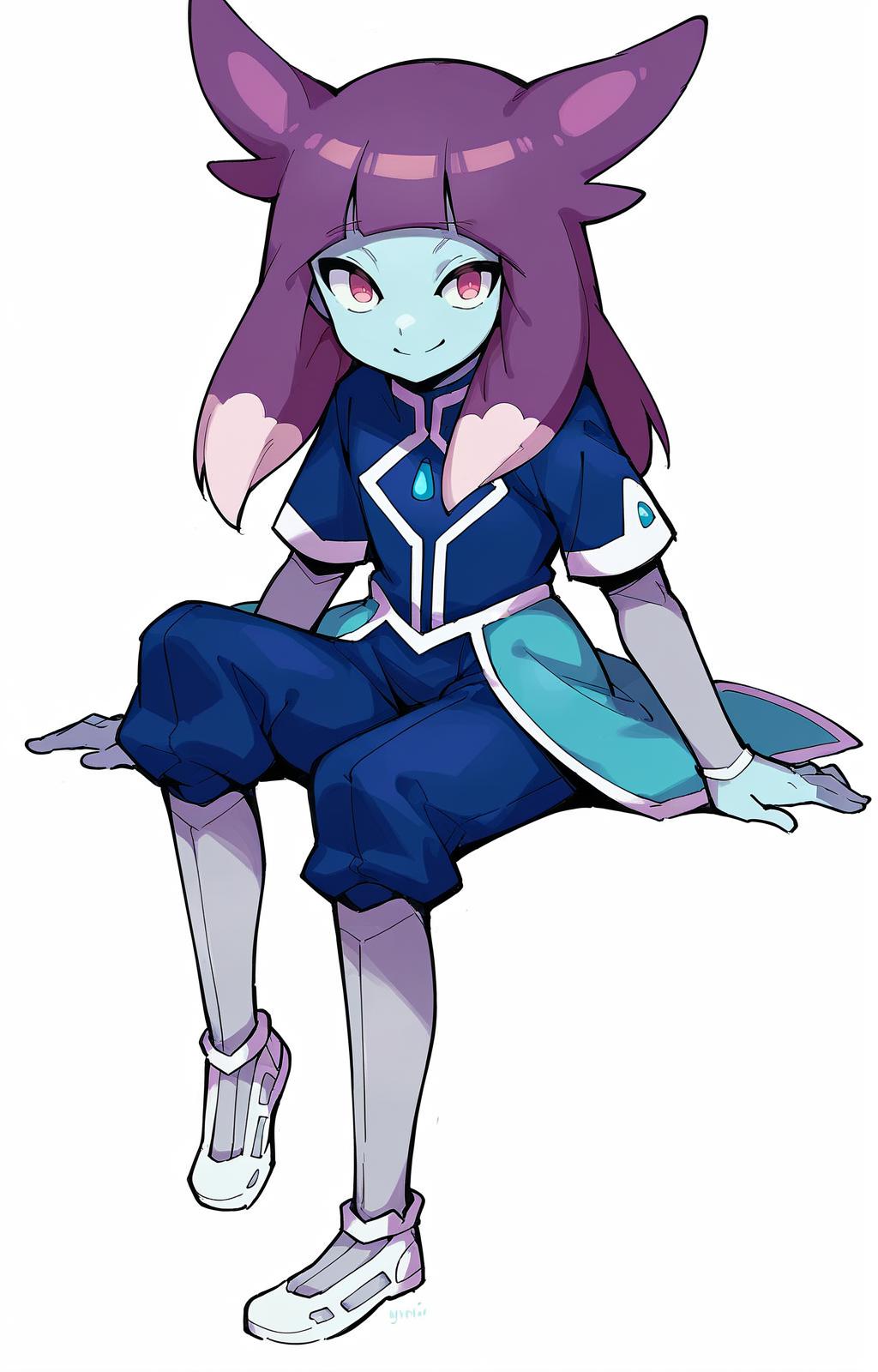 biicha, blue skin, purple hair, two-tone hair, multicolored eyes, purple eyes, pink eyes