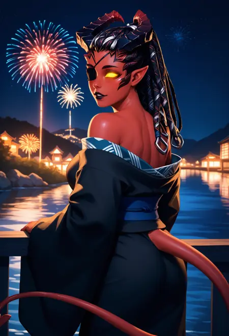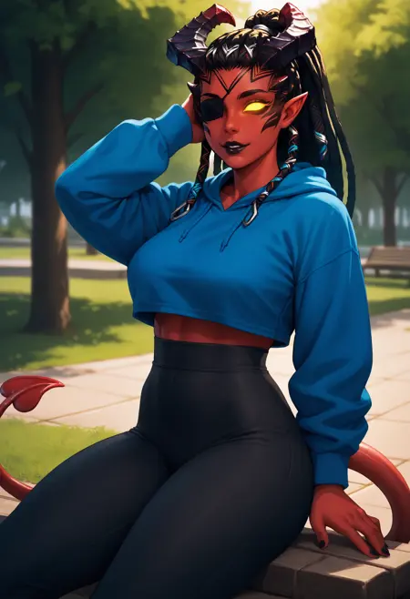항상 필요: "killisub, 덤불 소녀, 색상이 있는 피부, 검은 입술, 악마의 뿔, 날카로운 귀, (안대:1.1), 노란 눈, 빛나는 눈, 동공 없음, 얼굴 문양, 덩굴머리, 말꼬리, 검은 머리, 스트라이프 머리, 긴 머리, 악마의 꼬리, 큰 가슴"