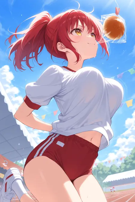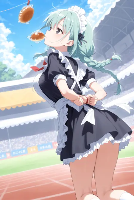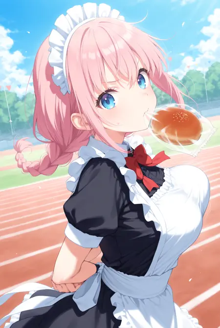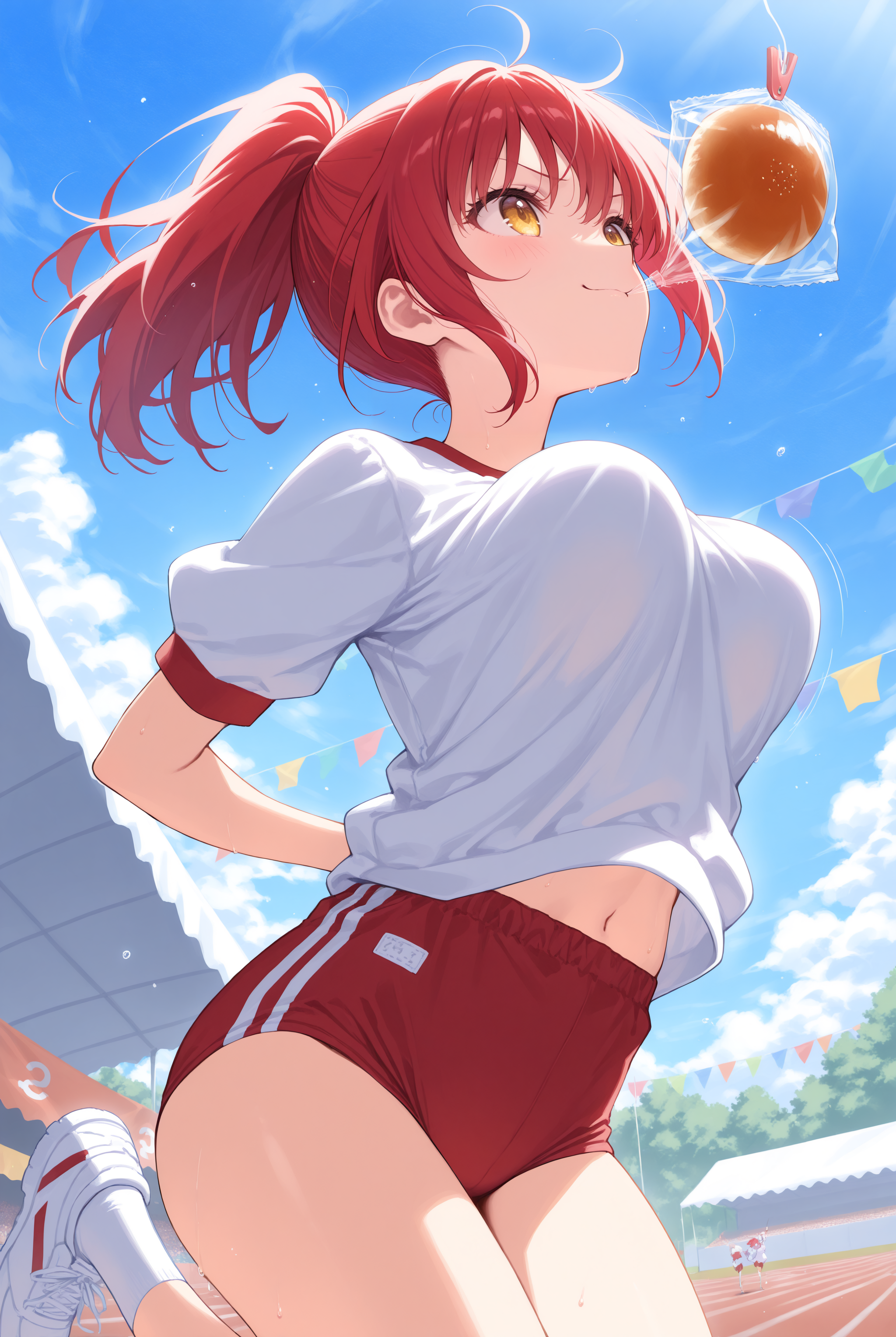 仅靠悬空的面包无法体现效果,建议您自行加入如sports festival、bread、arms behind back、open mouth、bouncing breasts、plastic bag等元素,使其更贴近真实场景。