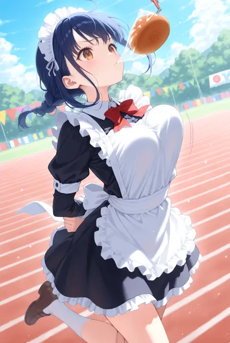 这是一个LoRA,用于日本运动会中经典项目:参与者不使用双手,仅凭嘴巴跳跃接住悬挂的面包。