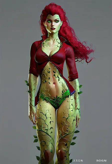 Poison Ivy, 1girl, solo, long hair, breasts, navel, cleavage, medium breasts, barefoot, colored skin, lipstick, red shirt, green skin, red hair, green eyes, glowing eyes, green thong