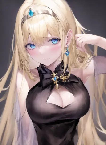 lora:mile2:1, watson amelia, hololive, mile (off8mile), 1girl, 金发, 蓝色眼睛, 脸红, 厌恶, 耳环, 珠宝, 长发, 看向观众, 官方 alternate 服装, 半身肖像, 阴影面容, 单人, 王冠, 上半身, 虚拟YouTuber