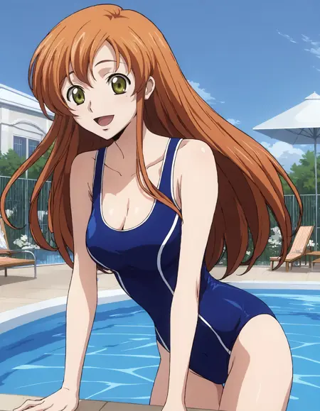 수영복 - 파란 일체형 수영복, 가슴 노출
