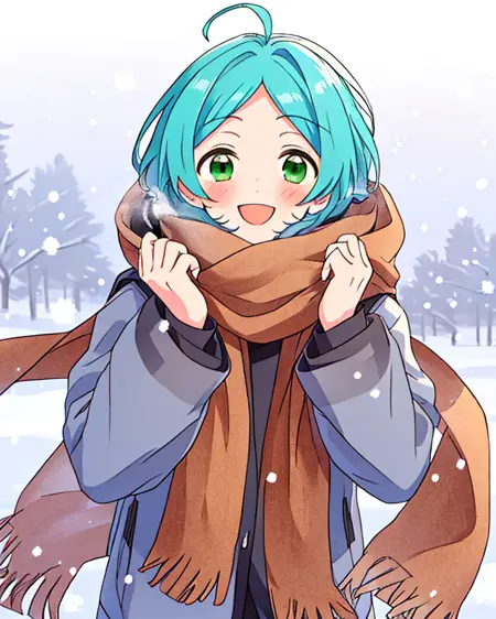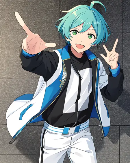 출력물은 청록색 또는 푸른색 머리카락을 가진 단발 남성으로, ahoge가 있어야 합니다. 푸카 푸카