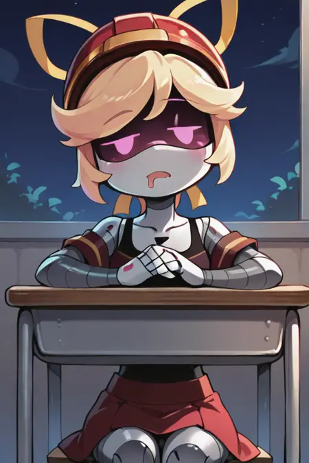 프롬프트: 리지, 금발, 분홍색 눈, 로봇, 투명한 헬멧, 빨간 헬멧, 노란 리본, 빨간 크롭탑, 검은 탱크탑, 빨간 치마