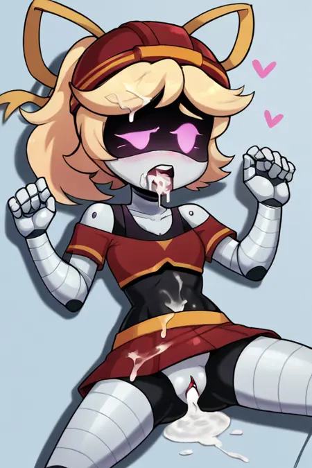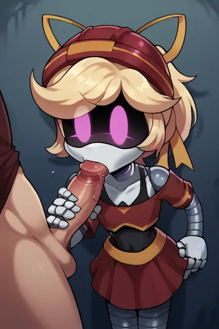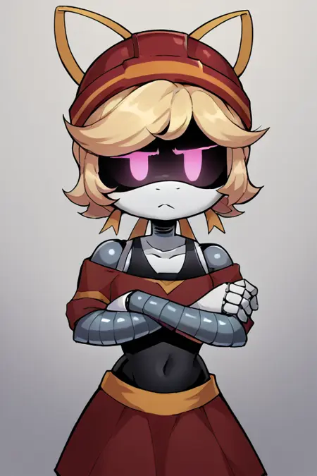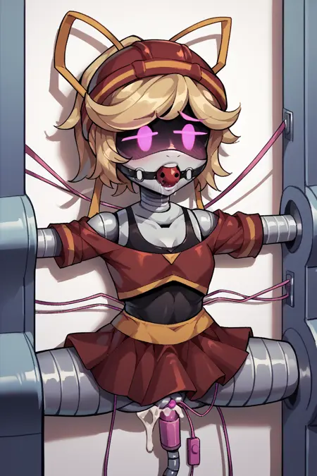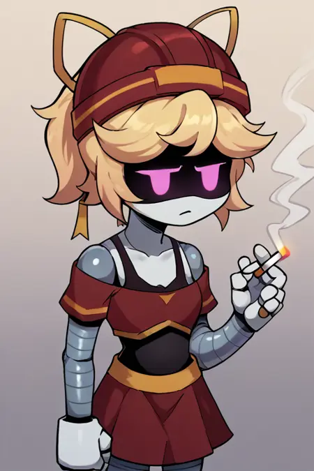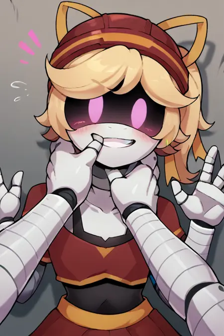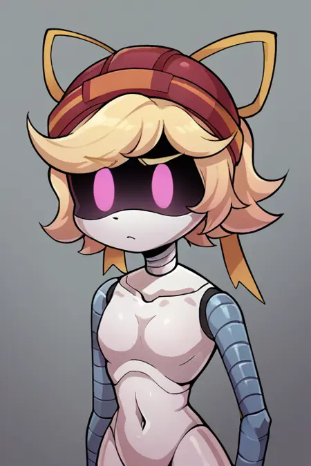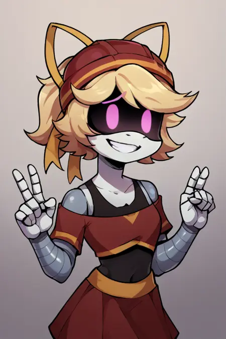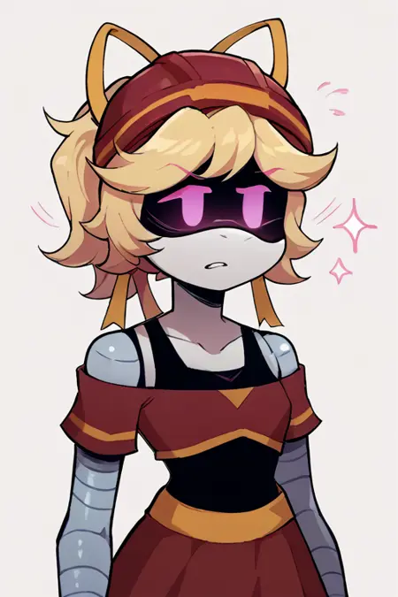 Prompts: Lizzy, Blonde Hair, Pink Eyes, Robot, Visor, red helmet, yellow ribbon, Red Crop Top, Black Tank top, red skirt