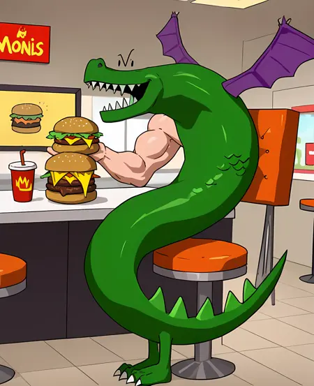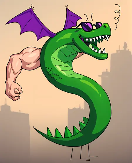 然后输入类似提示:“龙人,插画,卡通龙,圆点眼睛,邪恶笑容,牙齿,绿色尾巴,尾部尖刺,紫色翅膀,一只强壮的手臂,棍状脚”