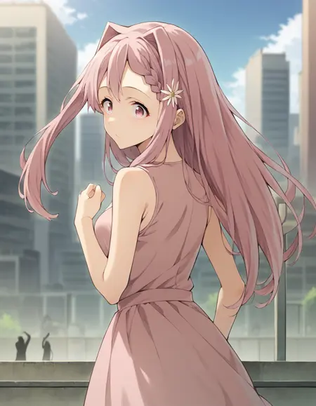 karen himemiya, pink hair, long hair, hair intakes, braid, hair ornament, pink eyes, sidelocks