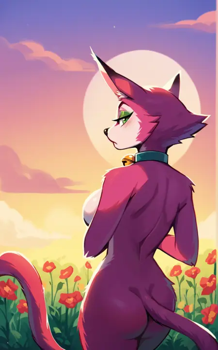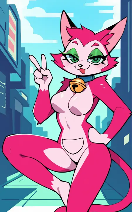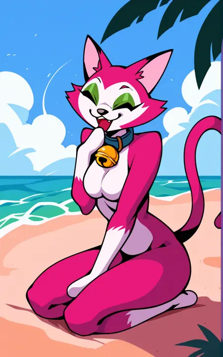 강화 태그: 동물 귀, 중간 크기의 가슴, 녹색 눈, 꼬리, 고양이 귀, 목줄, 고양이 꼬리, 종, 메이크업, 반쯤 감은 눈, 고양이 소녀, 작은 종, 목에 달린 종, 털이 많은, 털이 많은 여자, 몸 털, 이색 털, 분홍색 털