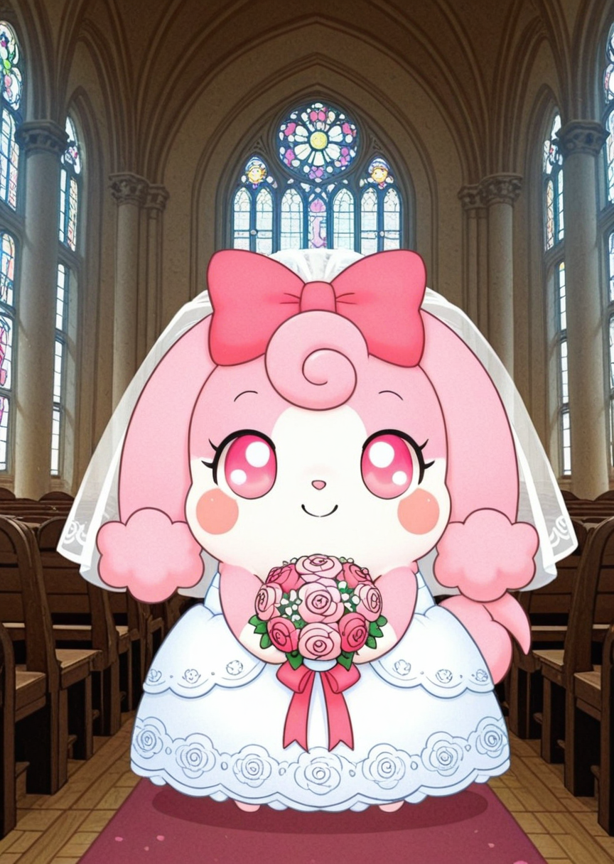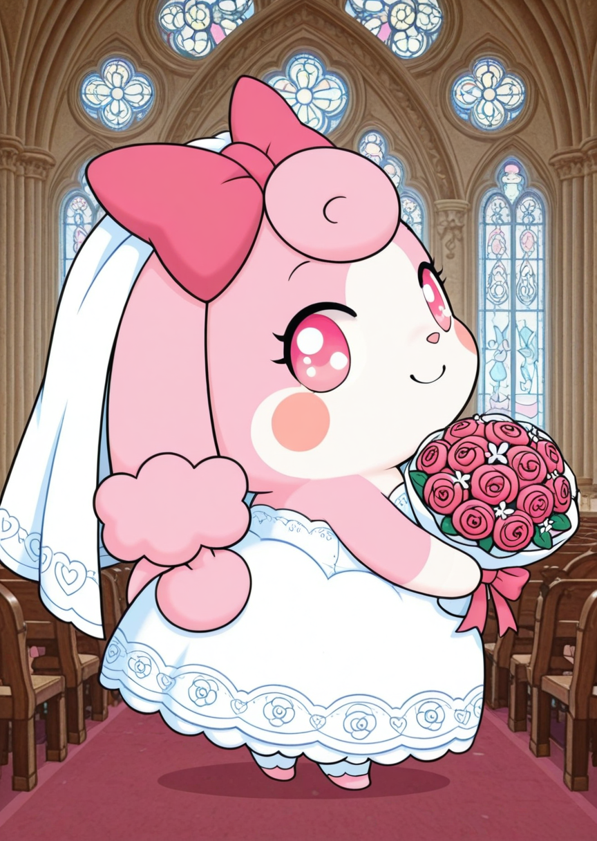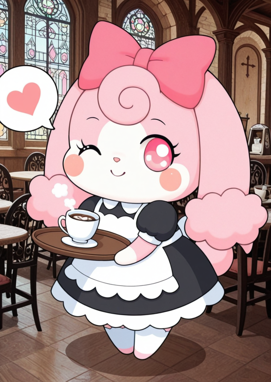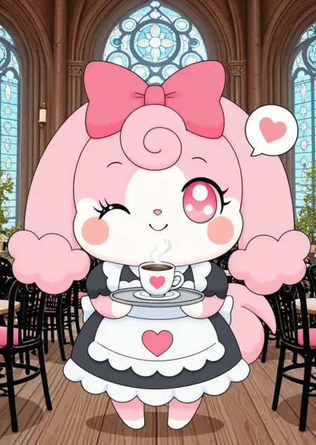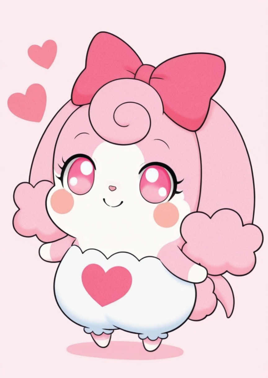 プロンプト: melory、 blush ステッカー、リボン、ピンクの目、髪のリボン、尾、ちび、ハート柄