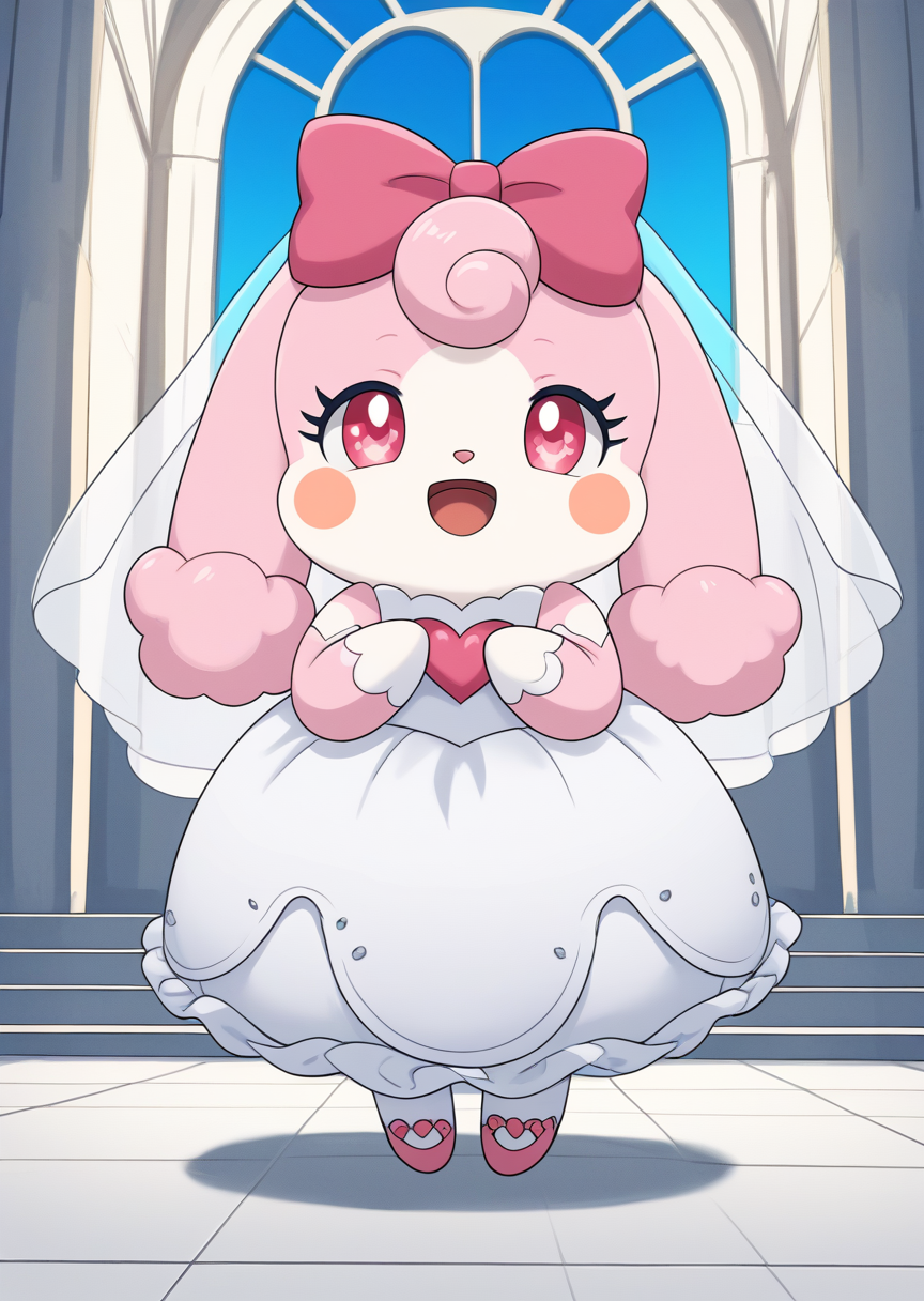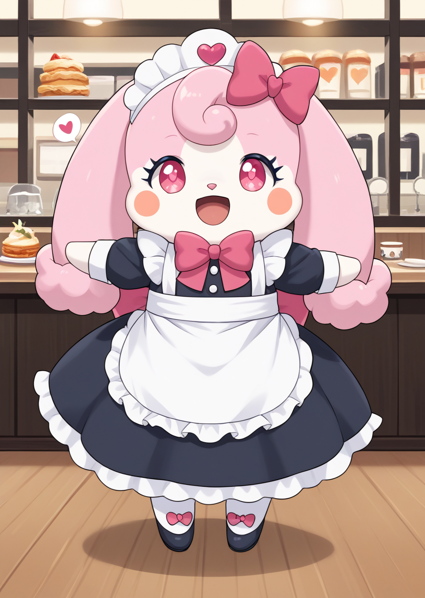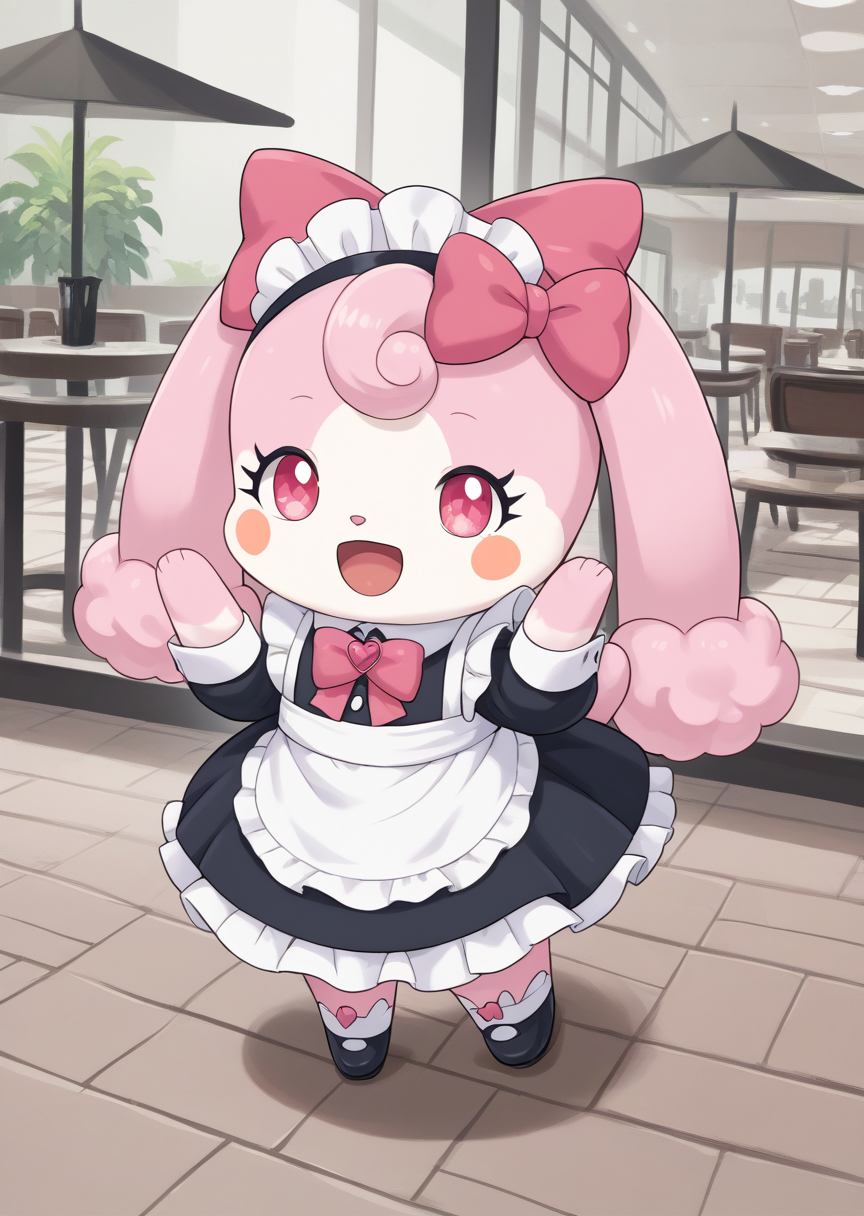 prompts: melory, blush stickers, bow, pink eyes, hair bow, tail, chibi, heart print