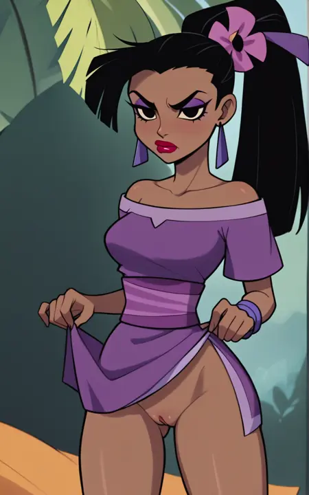 強化タグ:黒髪、ポニーテール、黒目、濃い肌、濃い肌の女性、化粧、赤い唇、髪の花**