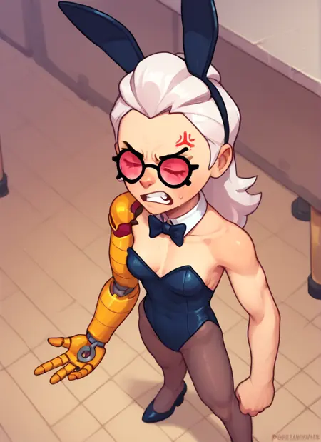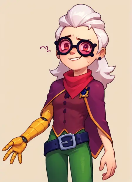 1 girl , bsbelle , white hair, tinted eyewear ,purple capelet,red scarf, single mechanical arm, single arm , brown shirt , green pants ,belt , solo ,