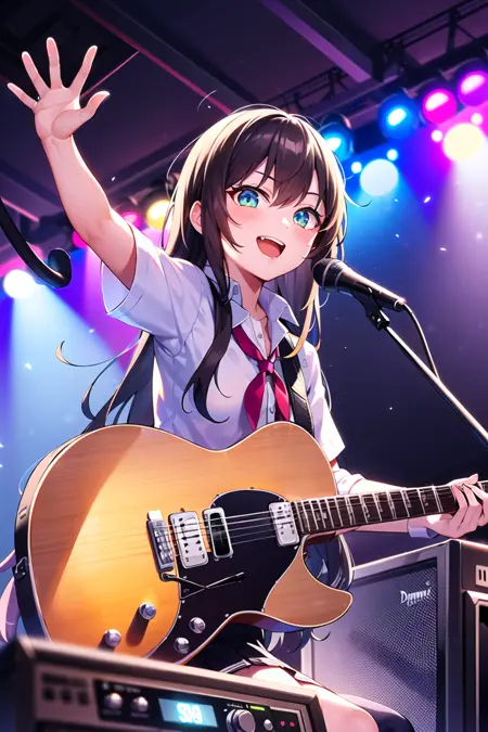 1girl, solo, cowboy shot, school, black guitar, amplifier, speaker, live stage, smile, Shining Lighting
