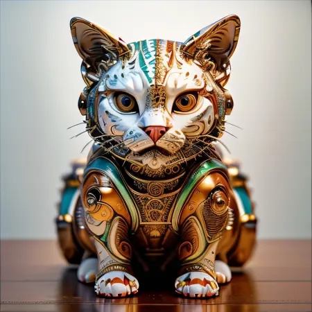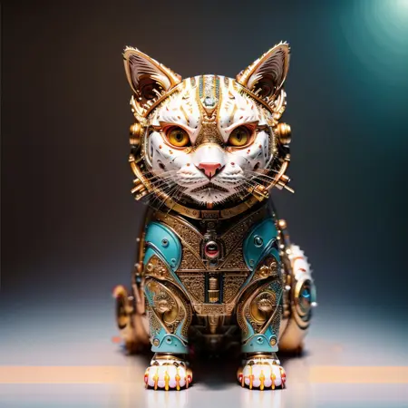 이 모델은 정면에서 앉아 있는 고양이 3장의 사진을 사용하여 학습되었습니다. 프롬프트에는 [name]과 [filetype]이 사용되었습니다. 사진들은 [filetype]의 사용에 따라 이름이 변경되었습니다. 기본 고양이는 기계 부품이 달린 흰색 고양이였습니다. 학습 단계는 총 10,000단계입니다.