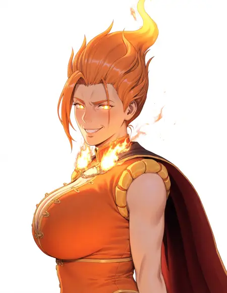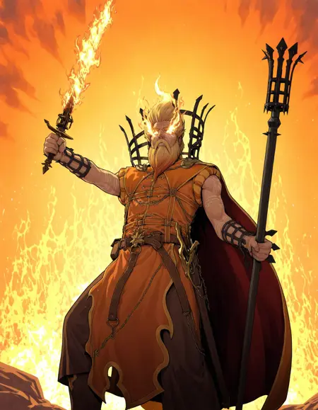 BrightWizard, glowing eyes, orange hair, facial hair, fire, tattoos, cape, belt, chains,
